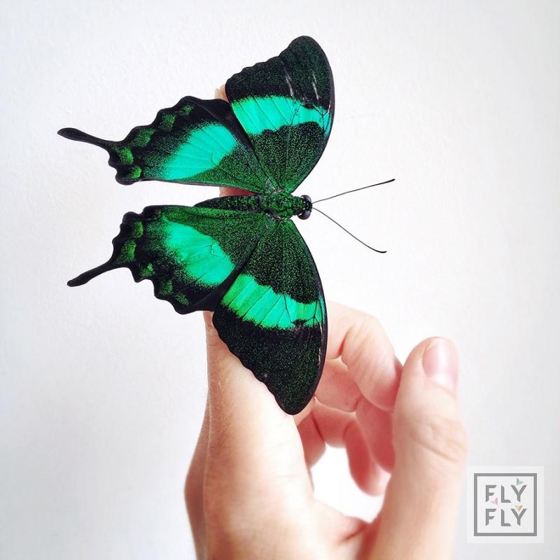 Размах крыльев до 12 см. Основной цвет крыльев - черный, с яркими малахитовыми полосами и точками. Полет быстрый. Идеальна как для салютов, так и в качестве подарка сама по себе. Живет до полутора недель.