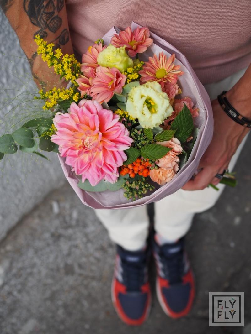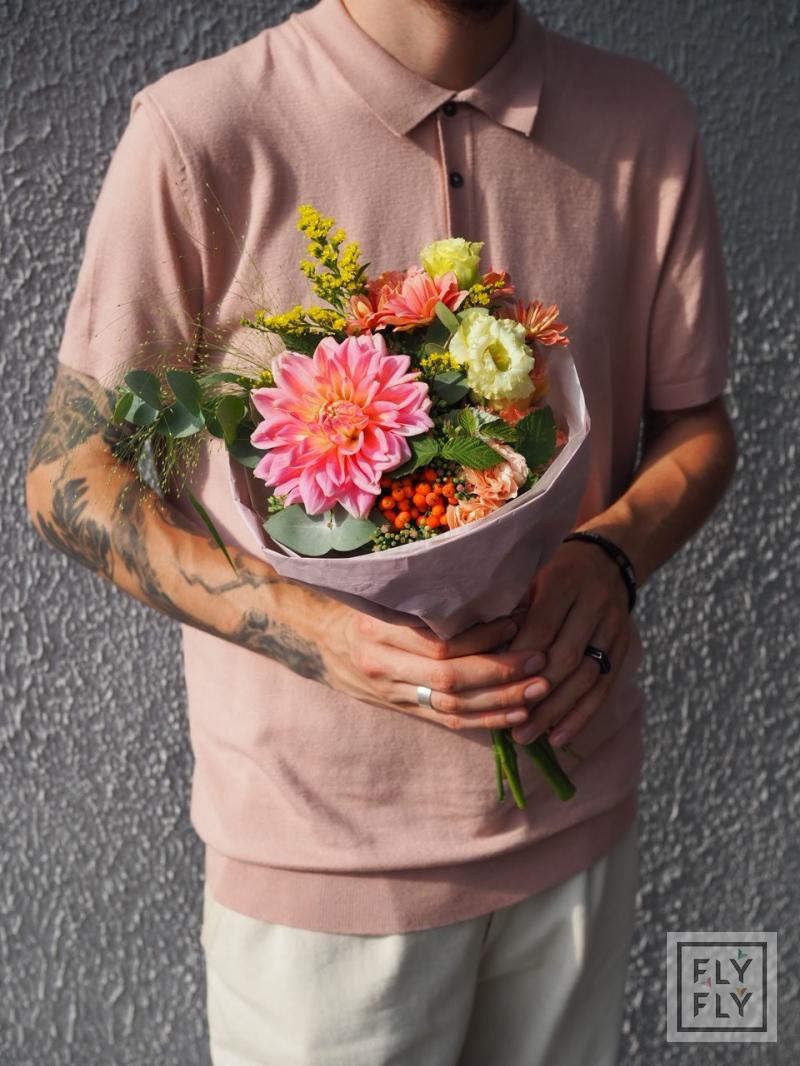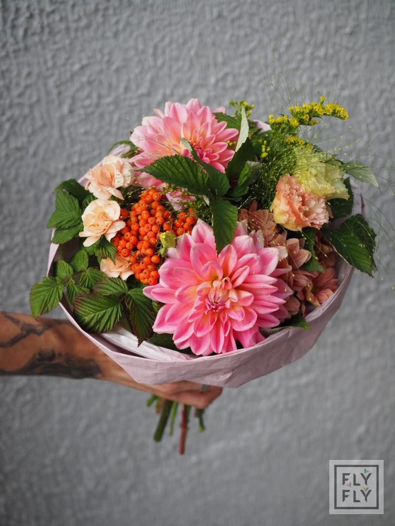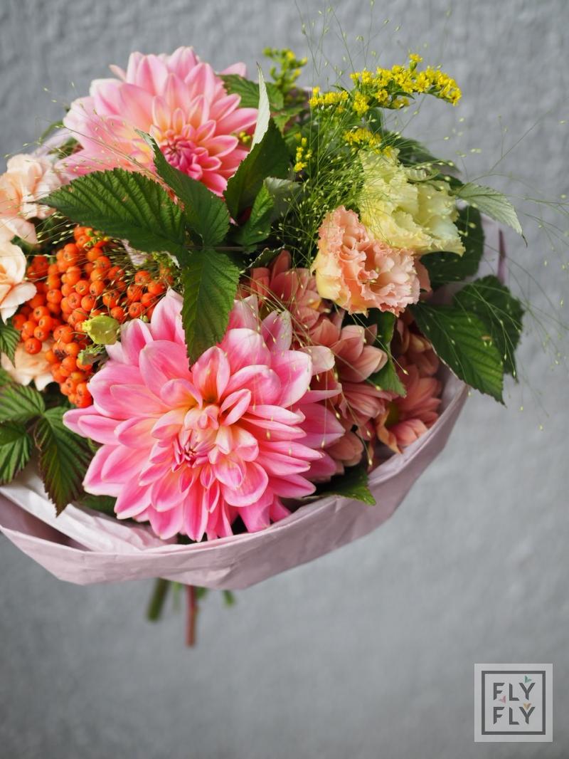 В составе: георгин, диантус, седум, хризантема кустовая, рябина, эустома, эвкалипт, солидаго, паникум и малина.